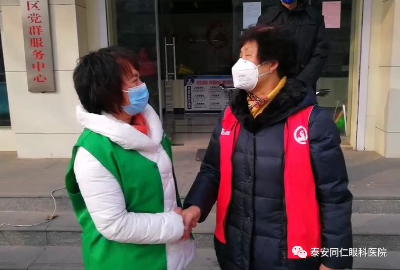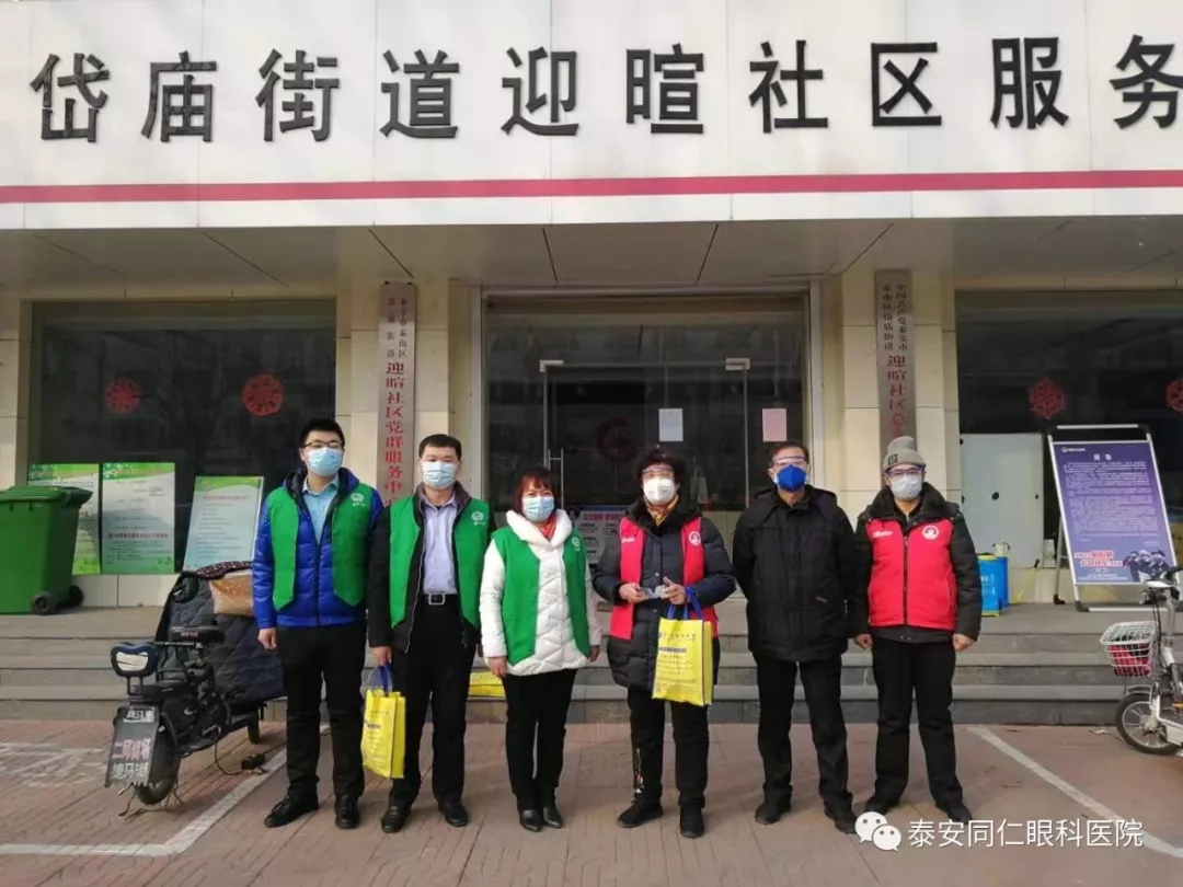 2020年2月7日,泰安同仁眼科医院联合泰安市健康公益事业发展协会向泰山区岱庙街道迎暄社区服务中心捐赠了护目镜50副,用于一线社区工作者的防疫安全防护,迎暄社区张书记代表一线抗疫工作人员接受了本批护目镜。