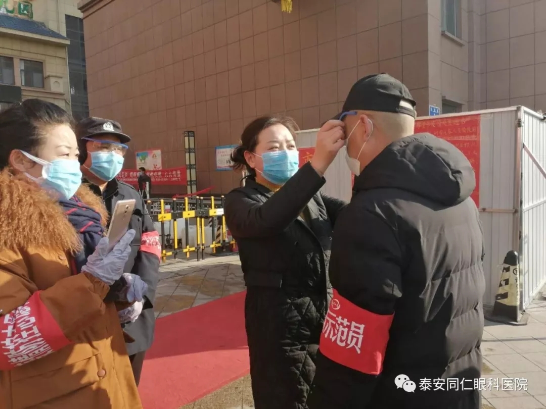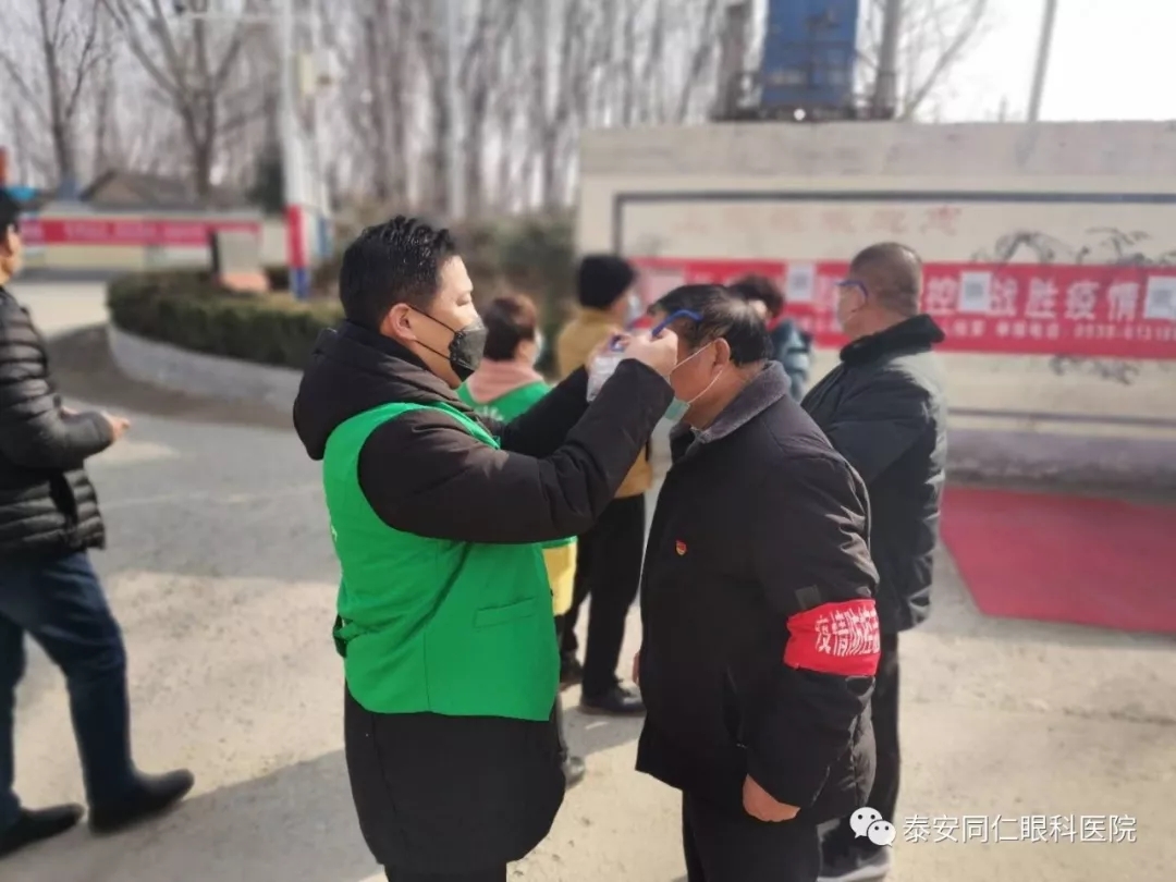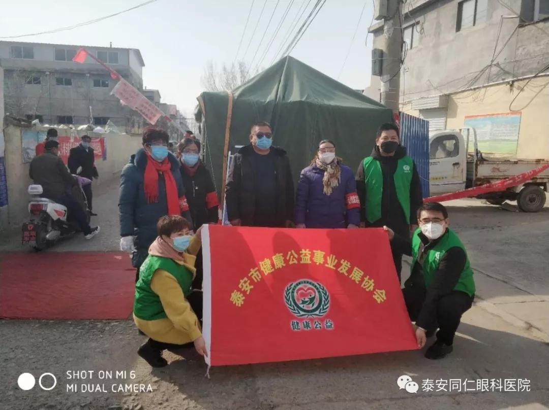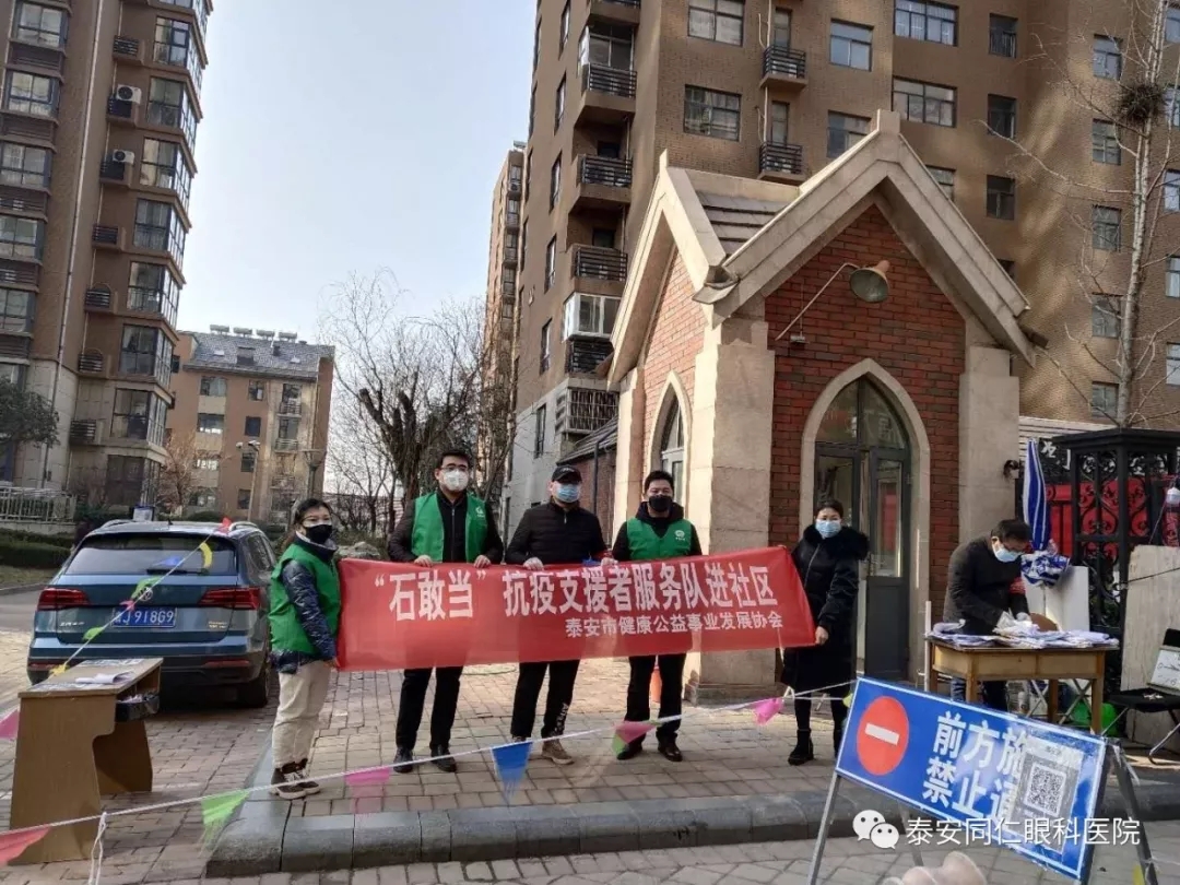 2020年2月19日,泰安市社会组织“石敢当”抗役综合应急服务队、泰安市健康公益事业发展协会、泰安市眼科学会联合泰安同仁眼科医院分别向上高街道办事处华上高镇社区,訾家社区、新訾佳苑社区、上上城社区、凤凰社区、魏家庄社区、泰景城社区、惠丰园社区、韩家结庄社区,岱庙街道办事处天悦府社区、迎春社区、南关园林社区,北集坡镇北店子村、南利家庄村,共为十四处一线防疫志愿者们捐赠了140副护目镜。