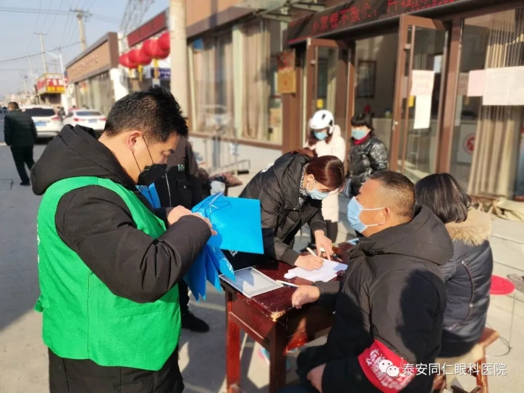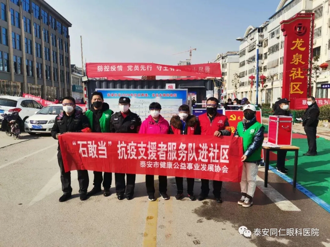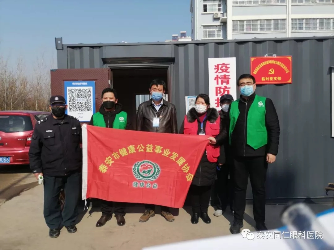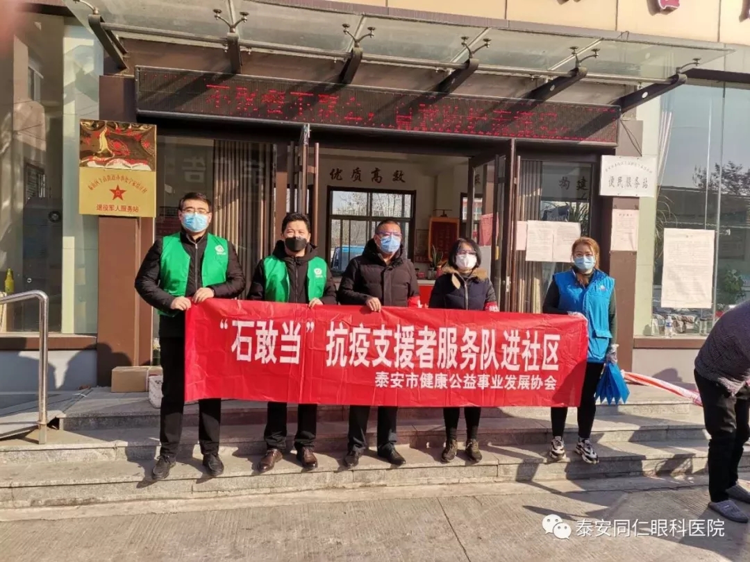 2020年2月20日,泰安市社会组织“石敢当”抗役综合应急服务队、泰安市健康公益事业发展协会、泰安市眼科学会联合泰安同仁眼科医院分别向上高街道办事处宁家结庄村、泰前街道办事处水牛埠社区,财源街道办事处西更道社区,英雄山社区、徐家楼街道办事处前灌社区、岱庙街道办事处花园社区,一中宿舍社区,中庭尚城社区,中悦城社区、北集坡镇对臼社区,龙泉社区等一线防疫志愿者们,捐赠了110副护目镜。