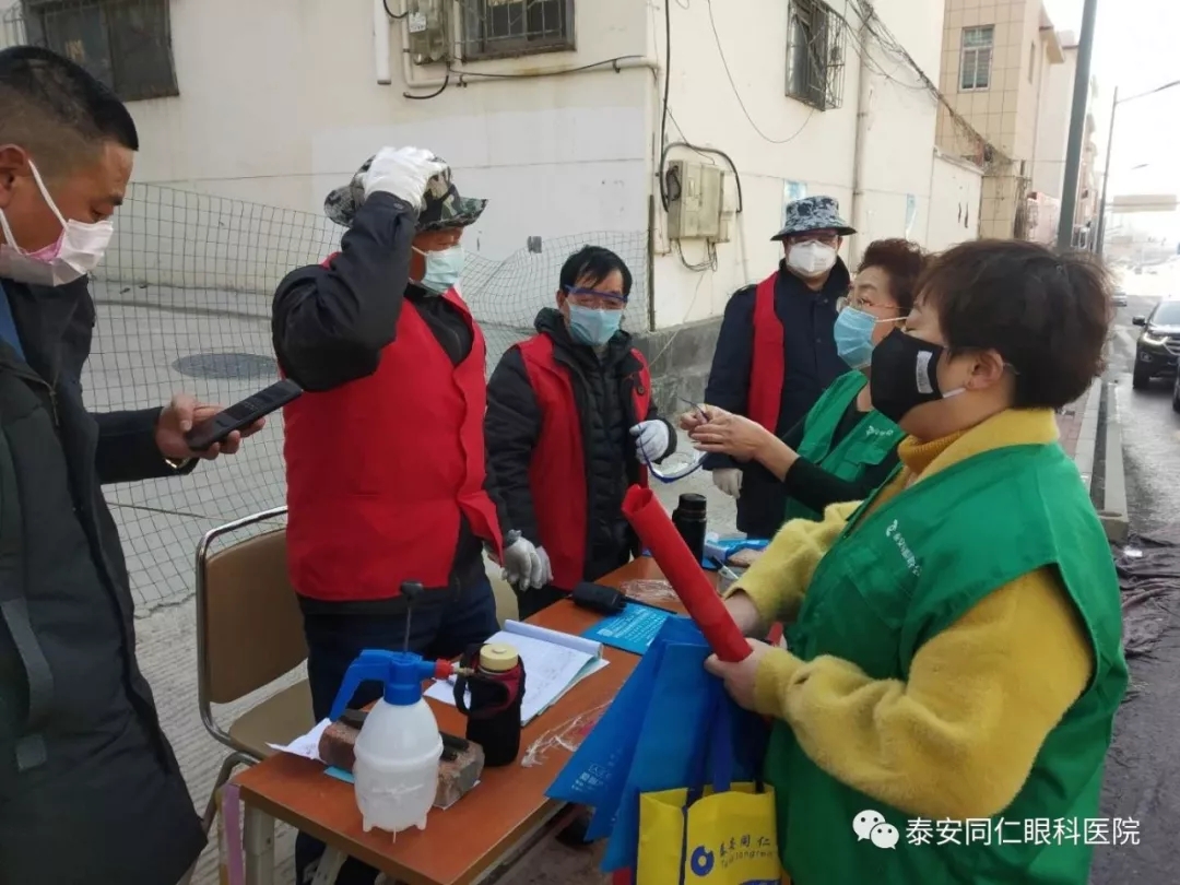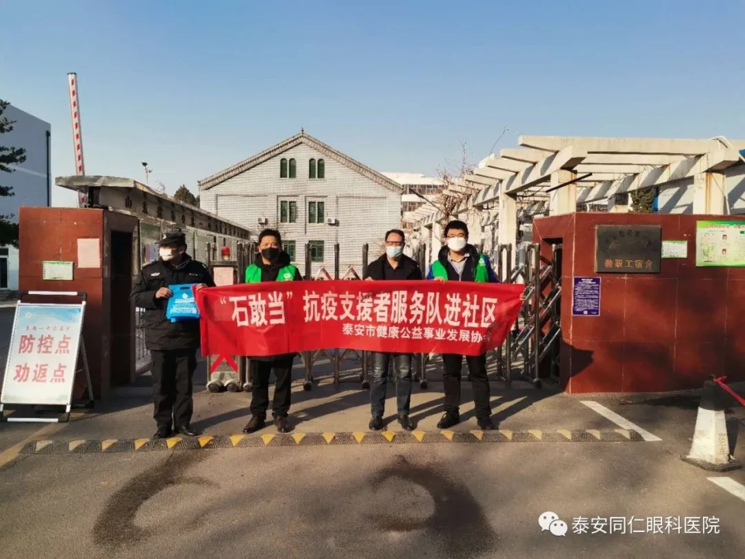 2020年2月20日,泰安市社会组织“石敢当”抗役综合应急服务队、泰安市健康公益事业发展协会、泰安市眼科学会联合泰安同仁眼科医院分别向上高街道办事处宁家结庄村、泰前街道办事处水牛埠社区,财源街道办事处西更道社区,英雄山社区、徐家楼街道办事处前灌社区、岱庙街道办事处花园社区,一中宿舍社区,中庭尚城社区,中悦城社区、北集坡镇对臼社区,龙泉社区等一线防疫志愿者们,捐赠了110副护目镜。