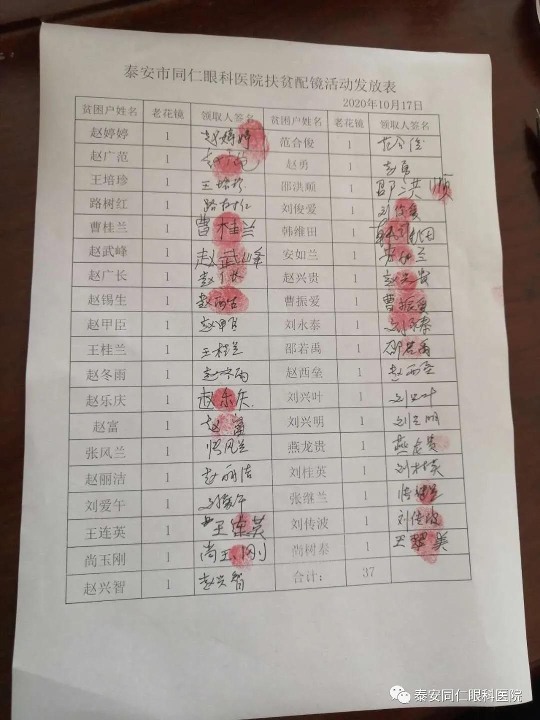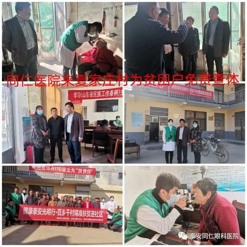 10月17日在泰安同仁眼科医院志愿者服务队分别在徐家楼社区夏家庄村、汶口、肥城、新泰、宁阳等地开展了精准扶贫义诊系列活动。为各地贫困户进行眼健康义诊,对建档立卡白内障患者进行免费手术,为37户贫困家庭送上爱心礼物。(价值500元的眼健康体检劵,价值198的老花镜)
