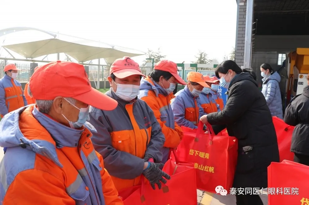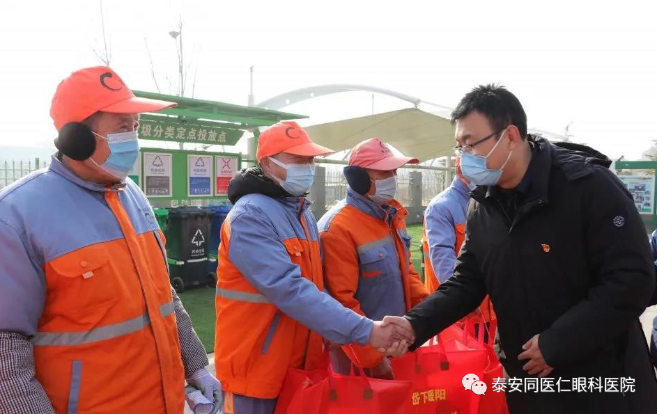 环卫工人是一个默默无闻、辛勤付出的劳动群体,为泰城的美丽与清洁默默贡献,我院联合健康公益事业发展协会为环卫工人提供了100套保暖衣,希望通过我们这点绵薄之力影响更多的人加入到‘关爱环卫工人”活动行列中来。协会将和环卫处结成友好单位,长期致力于环卫工人的眼部健康,作他们光明的守护神。协会将设立环卫工人休息点,饮水处,公共卫生间,为他们提供各种便利服。