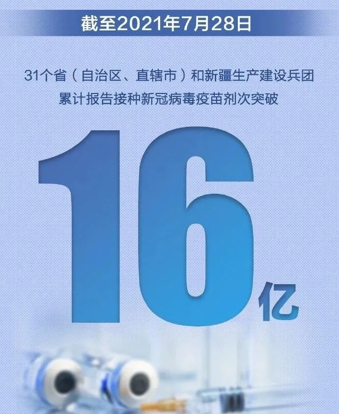 据国家卫健委最新数据显示,截至2021年7月29日,31个省(自治区、直辖市)和新疆生产建设兵团累计报告接种新冠病毒疫苗161921.8万剂次。