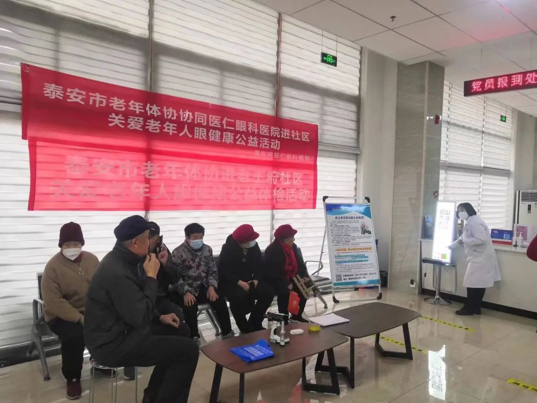 为倡树新时代美德健康生活方式,宣传普及眼健康科学知识,增强居民爱眼护眼意识,2023年2月11日下午,泰安市健康公益事业发展协会联合泰安同医仁眼科医院、泰安市老年体协来到岱岳区粥店街道办事处老王府社区,为社区60岁的老人进行了免费眼部筛查和老年人眼部常见疾病科普讲解。