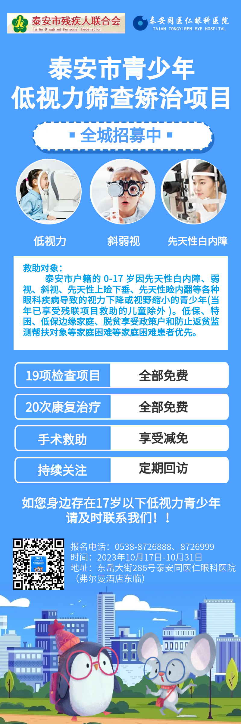 为关注泰安市青少年的身心健康成长,使更多患有眼疾的青少年得到及时有效的治疗,泰安市残联启动“2023年泰安市青少年低视力筛查矫治项目”,救助我市0-17岁患低视力、弱视、斜视、先天性白内障等眼疾的青少年。