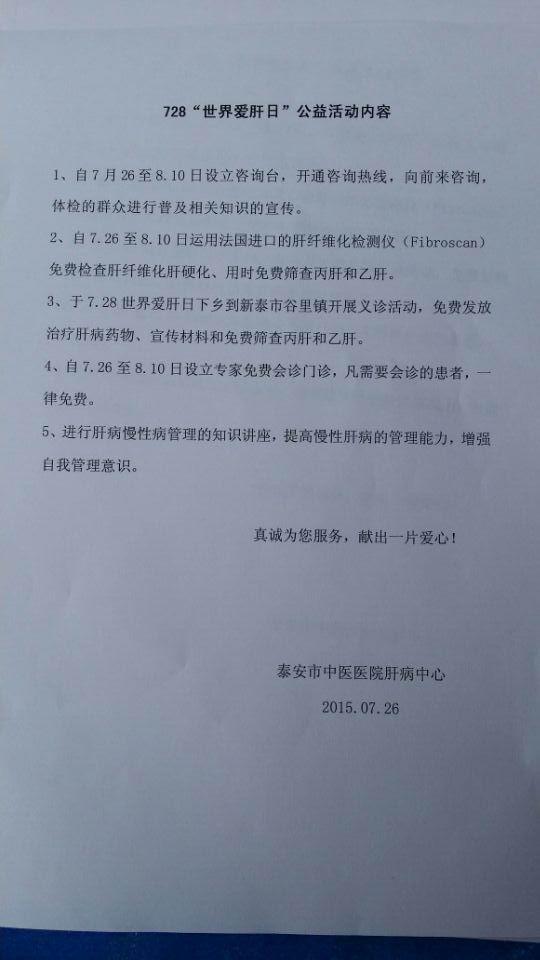 今天(2015年7月26日),泰安市健康公益事业发展协会联合泰安市中医医院肝病科,在肝病科门诊部举行了与全国联动的宣传活动。参加活动的还有泰安市老年公益协会的众会员,他们的积极性和热情感染了更多的爱心志愿者。