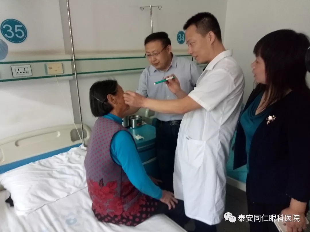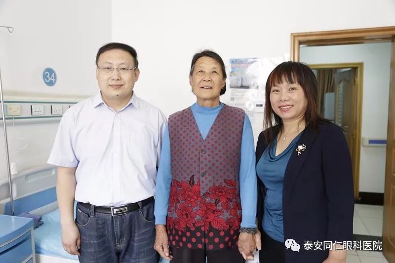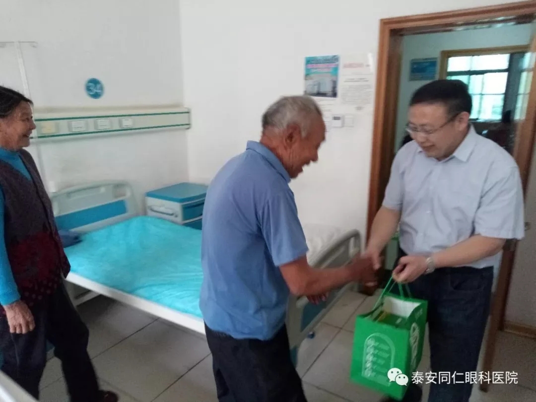 老人和老伴在李书记的帮助下来到泰安同仁眼科医院进行治疗。经核实,老人为建档立卡贫困户,享受 “光明扶贫工程·白内障复明”项目政策全额资助并使用了高端折叠软晶体。术后李书记亲自来到医院探望老人并送来慰问品。