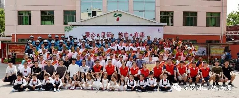 志愿者队伍在泰安市中心血站院内集会。