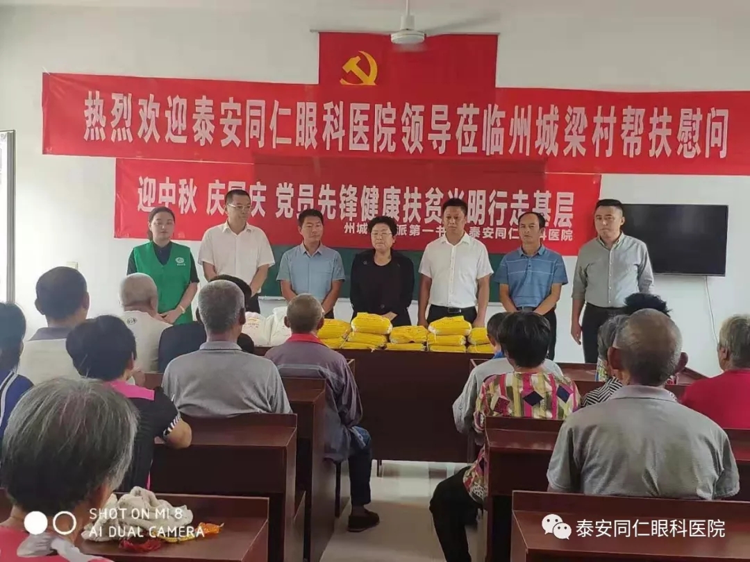 为深入贯彻落实习近平总书记提出的“精准扶贫、精准脱贫”指示精神,让贫困户感受到党和政府的温暖,使其过一个愉快祥和的仲秋佳节和国庆节。9月11日,泰安同仁眼科医院党支部、泰安健康公益事业发展协会联合东平县州城街道办事处党支部为辖区内精准扶贫困难户送上了节日的问候,为68户贫困家庭赠送了米、面等慰问品,并为其进行了眼部健康检查和健康知识普及。
